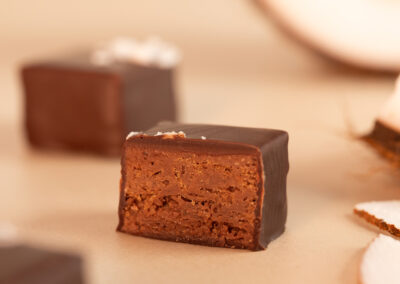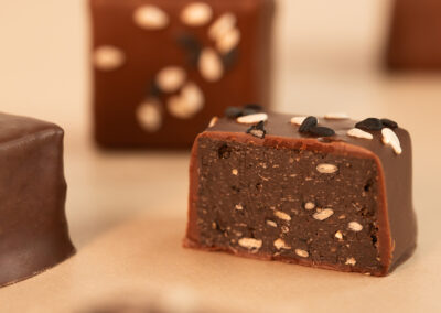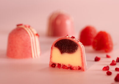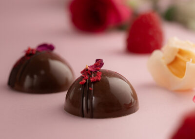Elegant & utterly delicious. A vibrant Raspberry, Rose & Lychee gel sits on-top of a smooth Raspberry, Rose & Lychee ganache with a layer of dark chocolate and crispy Raspberry pieces encased in a milk chocolate shell.