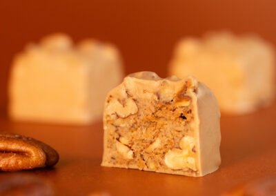 Crunchy caramelised pecan praline with pure maple syrup and caramelised white chocolate.