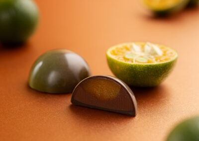 Juicy Calamansi gel with a silky Calamansi chocolate ganache encased in decadent dark chocolate. Calamansi is a magnificent citrus fruit native to the Philippines and grown primarily in south-east Asia. Bursting with flavour singing notes of mandarin, lime, grapefruit, yuzu and orange. My favourite citrus fruit!
